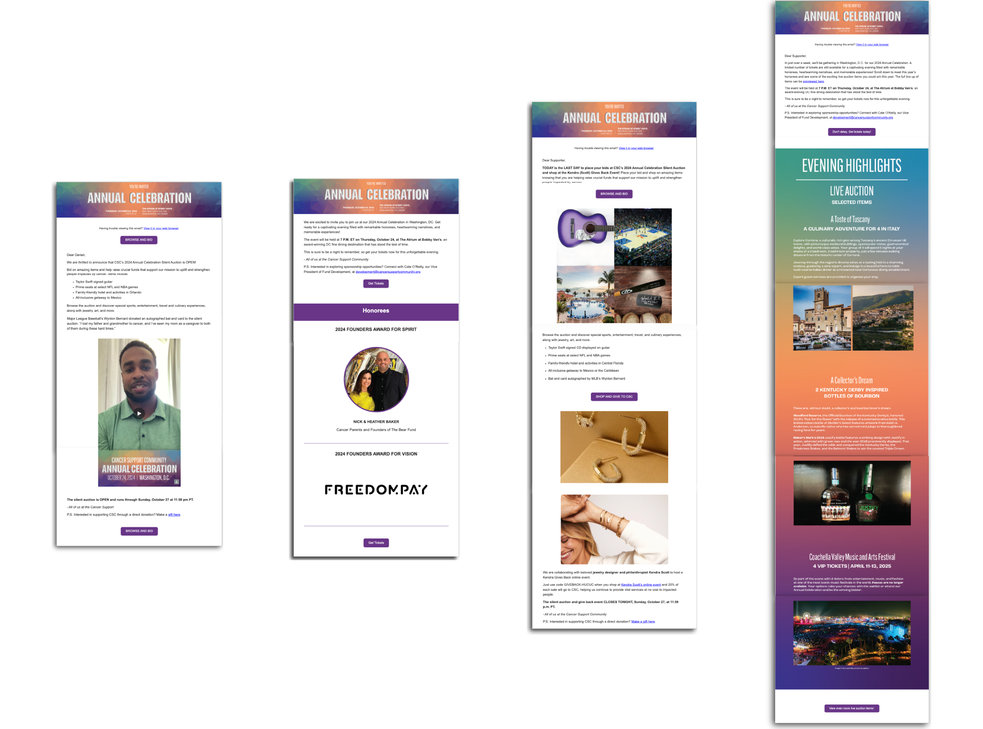 In 2024, the Cancer Support Community hosted its Annual Celebration in Washington, D.C.—a night filled with inspiring honorees, heartfelt stories, and memorable moments. I led the design efforts, developing the event identity and all supporting touchpoints. I also supported the AV team, ensuring the event presentation ran smoothly during the event.
