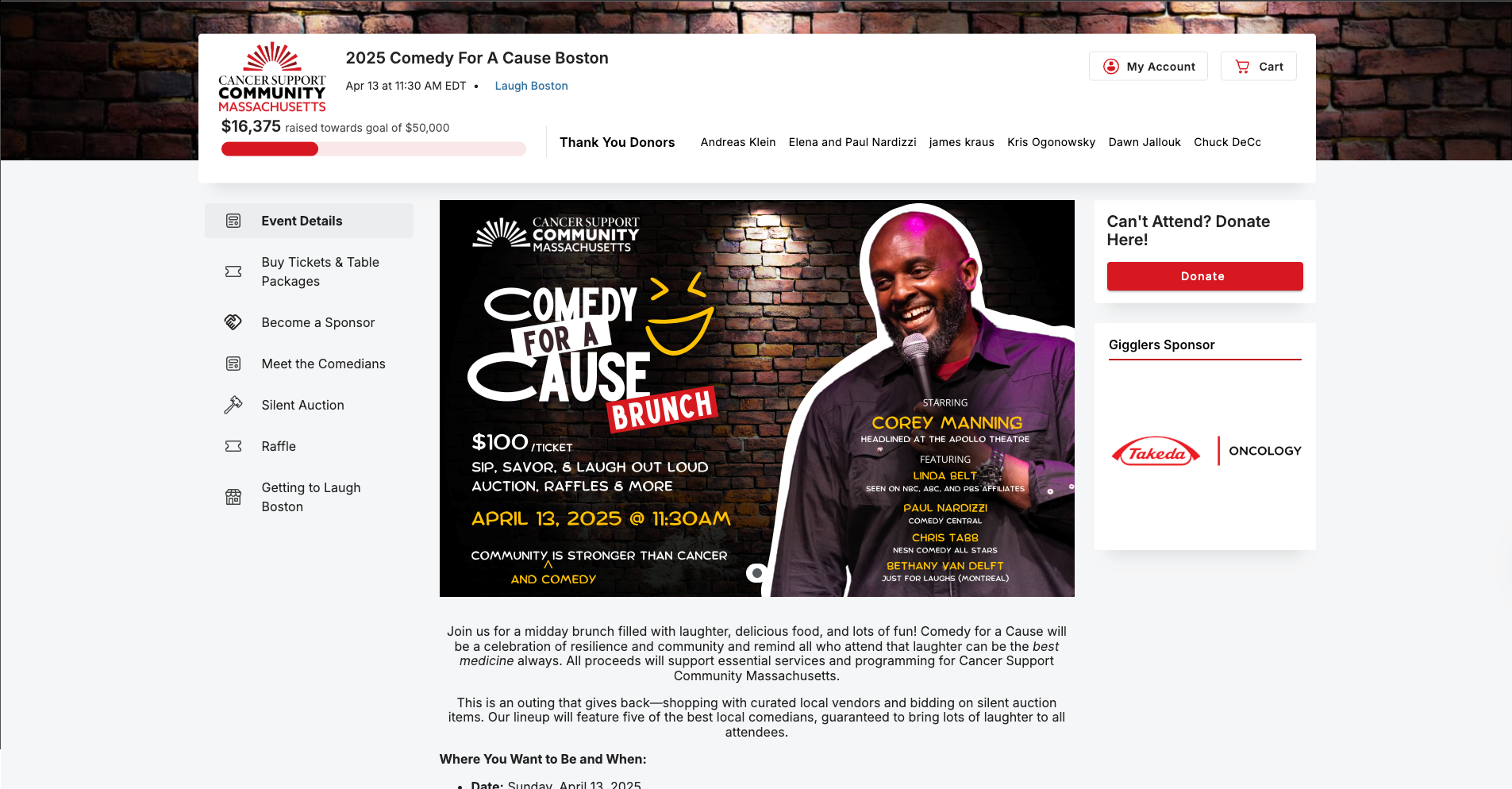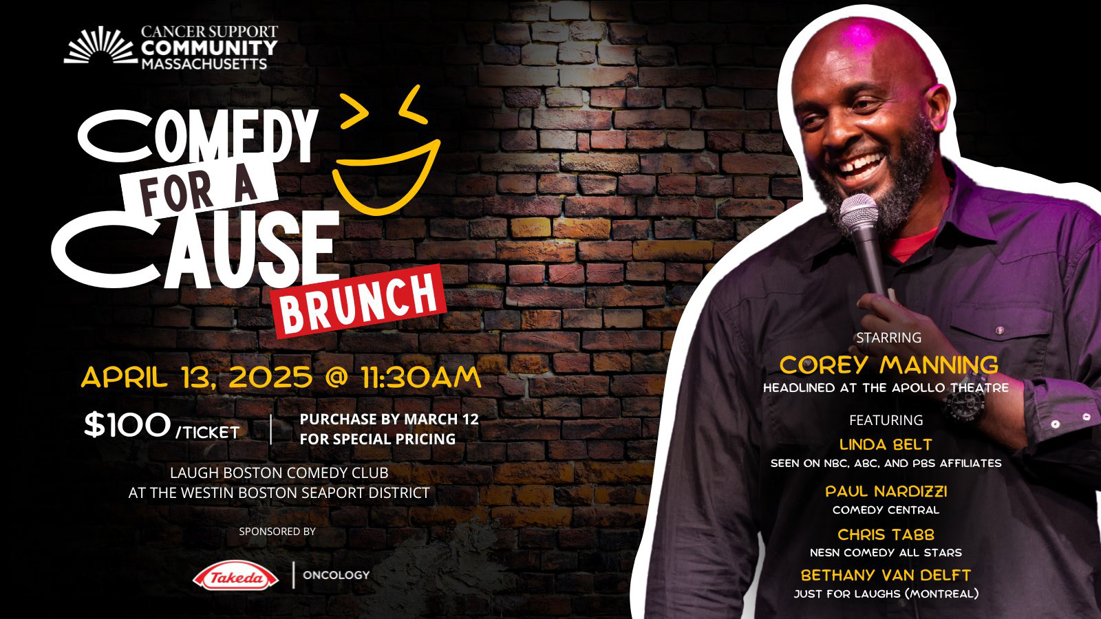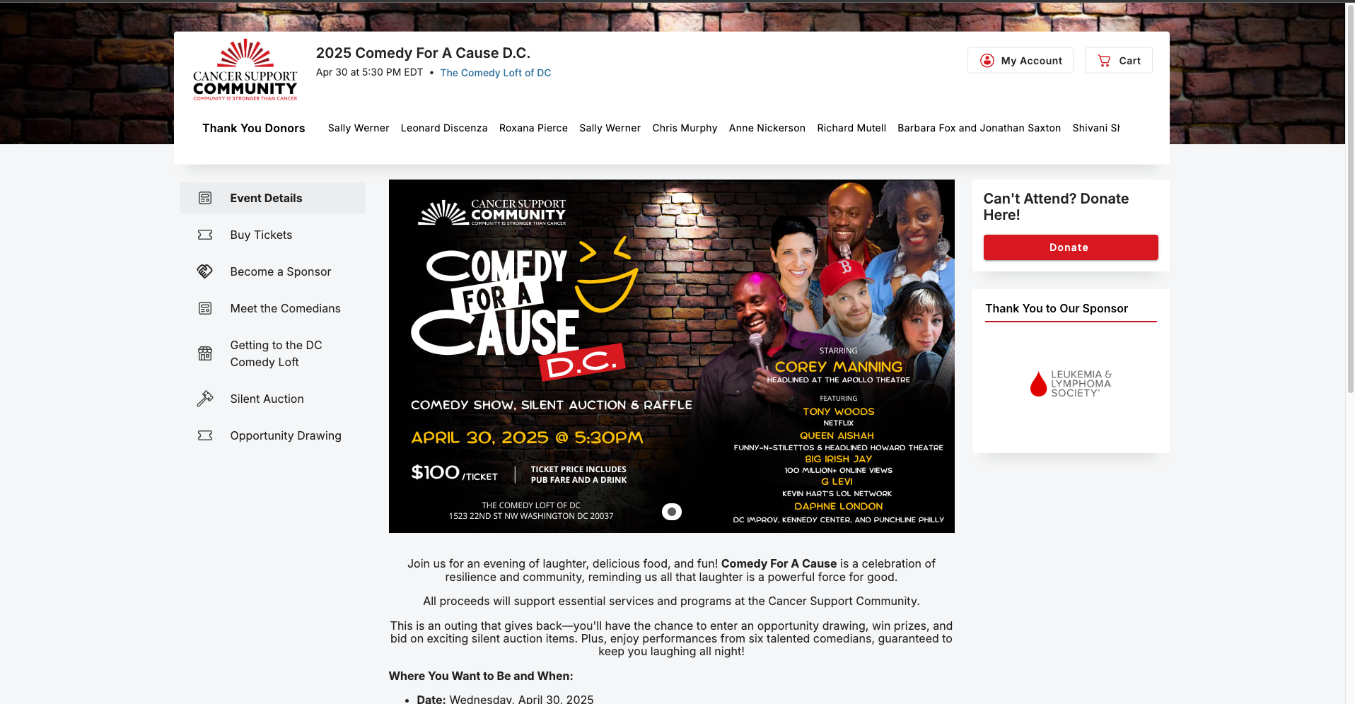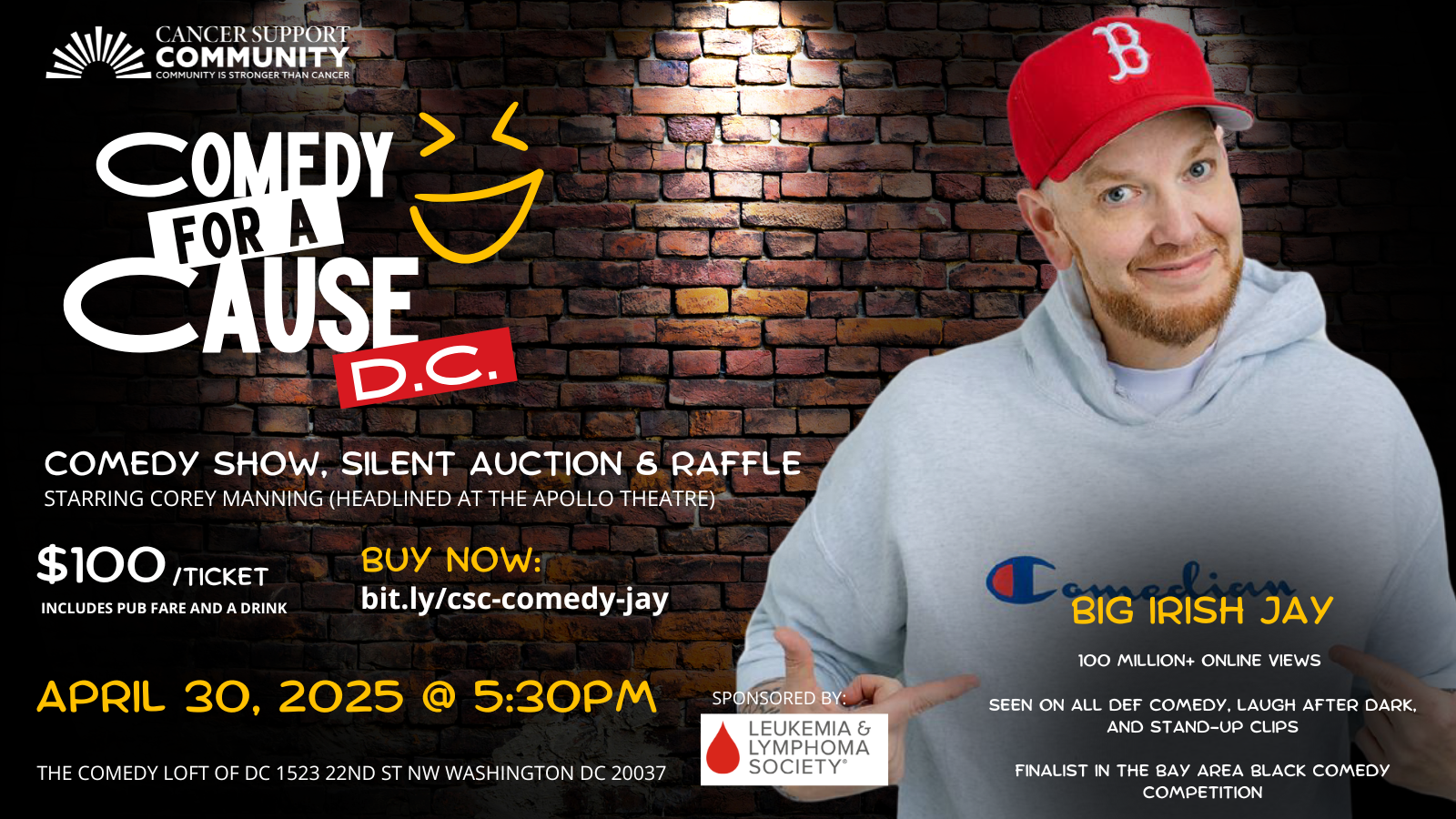 Comedy For A Cause was a series of two fundraising events celebrating resilience, connection, and the healing power of laughter—all in support of the Cancer Support Community headquarters in Washington, D.C., and Cancer Support Community Massachusetts. The events brought together comedy, community, and purpose to raise critical funds for free cancer support and navigation services. I led the design and visual storytelling for these events, creating a cohesive event identity that balanced warmth, humor, and mission-driven messaging. The goal was to convey both the fun and lighthearted nature of the comedy show and the meaningful impact of giving back. The events consisted of two evenings, one at Laugh Boston and the DC Comedy Loft featuring ten acclaimed comedians, headlined by Corey Manning, along with dinner, drinks, opportunity drawings, and a silent auction—all designed to encourage attendance, engagement, and generosity.