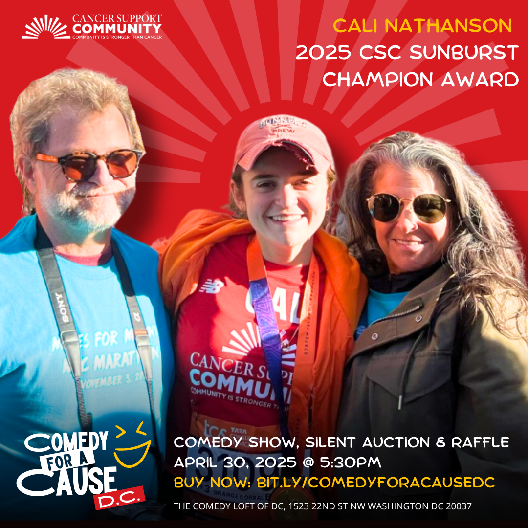 Cali Nathanson, a participant who ran in honor of her sister and represented the Cancer Support Community in the 2024 TCS New York City Marathon, was recognized during the event with the 2025 CSC Sunburst Champion Award.
